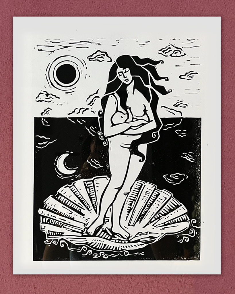 Linocut is a printmaking technique in which the design is etched into the surface of linoleum with the uncarved areas representing the reversal (mirror image) of the final hand-printed piece onto the paper.
